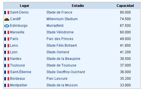 El partido Inaugural, como la gran final serán disputados en el Stade de France, con una capacidad para 80.000 personas, también habrá dos sedes fuera de Francia, una en Edimburgo, Escocia y la otra en Cardiff, Gales.